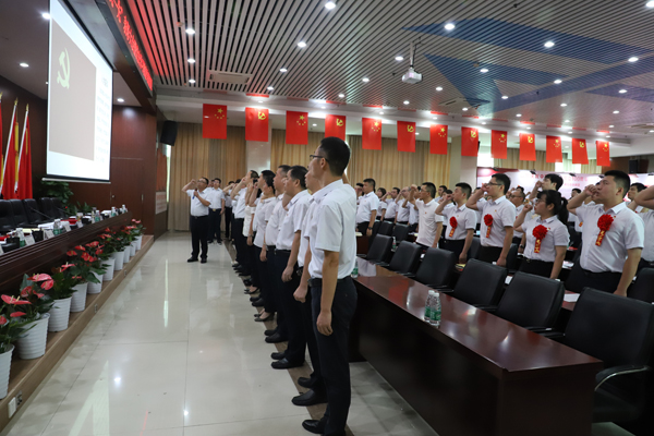 会议在全体参会人员齐声高唱《国歌》中拉开帷幕。面向鲜艳的党旗,新党员代表宣誓、老党员重温入党誓词。
