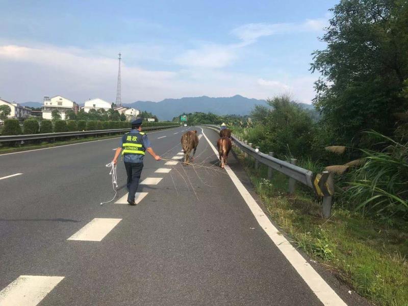20分钟后前来支援的路管队员陆煦、唐僖何赶到现场,上演了“赶牛记”,赶牛的同时,看到了寻找牛的主人,据了解因连日下雨牛棚损坏牛群才如此撒欢。