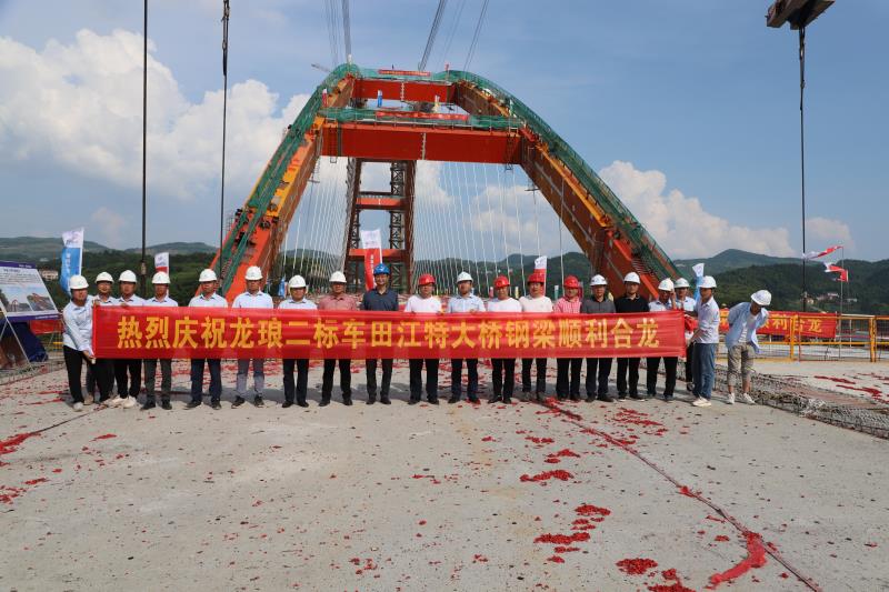 2021年7月7日下午16时18分,伴随着最后一个吊装梁段的顺利就位,被誉为“三湘第一拱”的龙琅高速车田江特大桥主跨280m中承式钢箱提篮拱桥——桥面格子梁顺利合龙,标志着龙琅高速控制性的重难点工程建设取得重大突破。