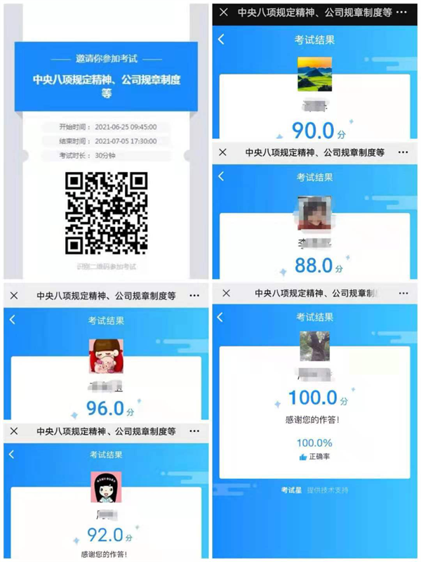 6月25日至7月5日,分公司纪委根据学习教育内容,制作170余道试题导入“考试星”网络平台,每套试卷均由系统随机组卷,包括单选题、多选题、判断题各10道共计100分,生成考试二维码链接。组织分公司121名党员通过扫描二维码链接参与答题考试,在限定的时间内作答,限定时间内未完成答题的将强制交卷,每名党员限答题一次。经统计,参考人员及格率100%,得分80分及以上的占50%,其中得分100分的15人,80分-99分的46人,80分以下的60人。