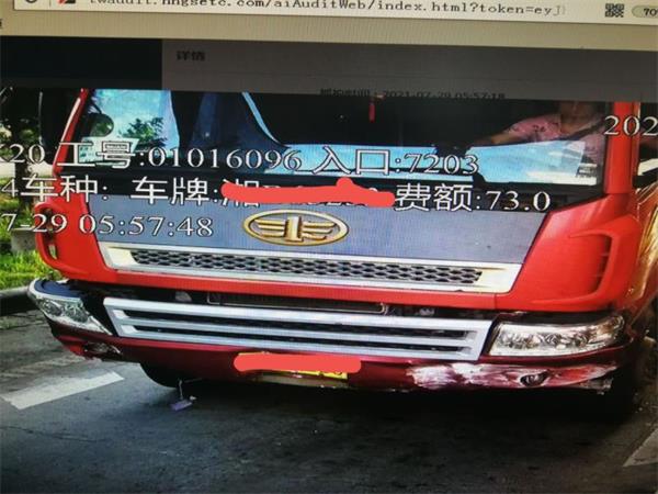 巡逻人员马上对江背收费站收费现场收费人员进行咨询并来到江背收费站监控室调取监控记录,在江背收费站的大力配合下,经过近两个小时的细心甄别,初部锁定该起逃逸事故的肇事车辆为一台湘B牌号货车,事故发生时间为29日凌晨五点五十分左右,该车从醴陵收费站上江背收费站下,进站照片车头完整,出站照片车头破损严重。