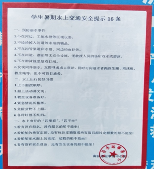 益阳南县水运中心设立水上交通安全专题咨询台,向群众发放了小学生水上交通安全知识读本和带有安全知识插画的作业本,并将防溺水作为重要内容,对有关危害和注意事项进行了宣讲,不断增强了社会公众的水上交通安全意识。暑假期间,还专门制定了《学生暑期水上交通安全提示16条》,从预防溺水事件、水上出行的好习惯、水上出行的“四要看”、“四不坐”三个方面进行提醒,多次深入学校开展宣传教育,在学生水上活动集中、事故险情易发渡口和涉水项目工地设置了安全警示牌,不断增强了从业人员防范未成年人溺水的责任意识。