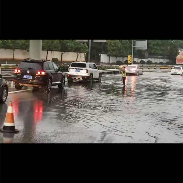 发现这一紧急情况后,当班监控员迅速通知路产、养护、交警、长沙县市政等部门来联合处理,并立即通知值班站长。值班站长刘智刚接到电话迅速赶往现场,并进行紧急分工,当班班长站在深水区警示和提醒司乘人员“小心慢行”;督导员站在拐角处指挥由北下高速的车辆减速慢行,避免与由南下高速的车辆发生碰撞;其他人员迅速在积水周围摆放安全锥筒和安全警示牌。