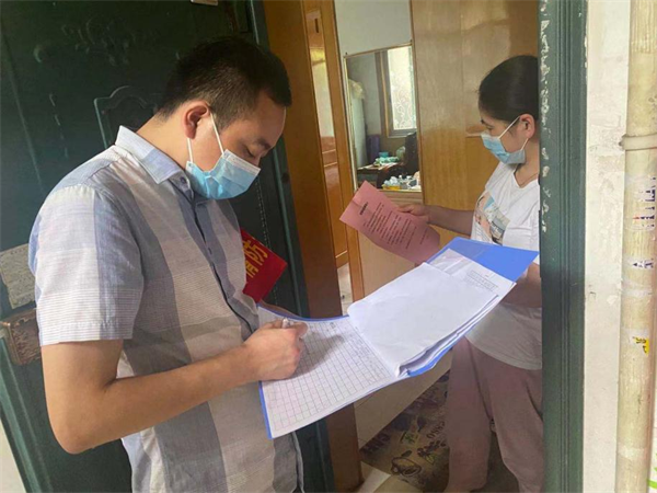 图为志愿者上门登记防疫信息