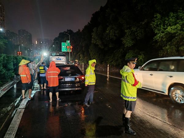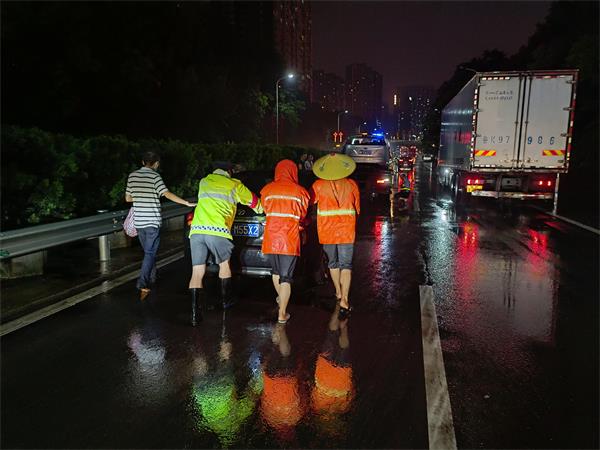 雨情就是命令,湖南高速长沙分公司长永路产大队闻令而动,立即启动恶劣天气应急预案,值班领导岳曙光带领应急小分队穿上雨衣迅速出发,一路上狂风暴雨,车辆在高速上前进都显得异常吃力。当车辆行使至K758+435M低洼积水地段时,现场一台小车发生故障无法动弹,后方车辆通行受阻,若不及时将故障车辆拖离现场,随着积水的不断上升,将会导致后方多台受阻车辆遭受损失,情况十分紧急,队员们迅速分工,一组由岳曙光带领2人留在现场,在积水路段摆放安全锥桶进行现场警戒,划定安全区域,阻止过往车辆继续前行,同时协助司乘人员将故障车辆推行至安全地段;一组在分队长黄凯的带领下前往长沙收费站内广场积水现场协助交警进行交通管制。