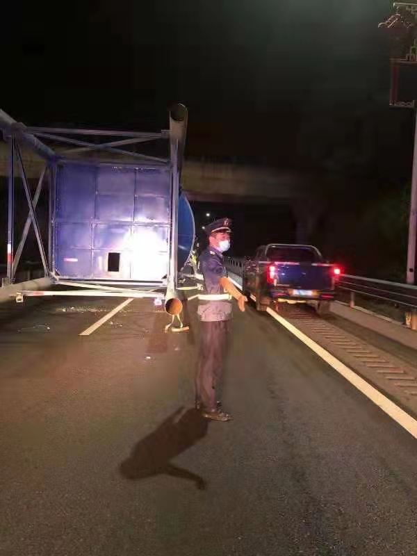 为预防次生事故的发生,高速路产人员迅速采取安全措施:在“肇事”车辆后方示警、设置警示标志,实施交通疏导,指挥滞留车辆依次从应急车道有序通过;同时联系高速交警、养护、施救等部门前往现场进行共同处置。后经多部门现场勘查,制定了具体的救援方案,但因罐体太大,夜间施救存在诸多不确定安全隐患,为确保安全,决定在现场设置好安全警示区域,路产、交警在现场示警,待天亮后再进行处置。