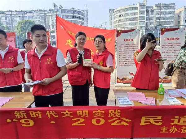 9月17日上午,在第十九个全国“公民道德宣传日”即将到来之际,益阳市资阳区交通运输局的志愿者们在区创文办统一组织下,在鹅羊池广场上开展了“公民道德宣传日”宣传教育活动。