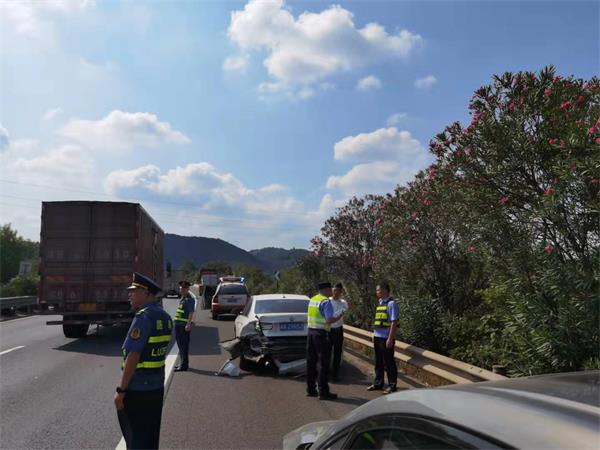 正在路面上巡查的郭雄大队长接到通知立即带领车上人员赶赴事发点。到达现场后,发现一台宝马车因被剧烈撞击,横摆在中央隔离带护栏上,尾部也被后车撞得严重变形;旁边一台别克商务车前、后挡风玻璃被完全撞碎,受损严重;另一台运载着麻石的大货车则是左前方受损,万幸的是现场无人员伤亡。见此情形,为避免发生二次事故,路管员立即协助先期达到的辖区高速交警对事发路段进行短暂交通管制,将三台事故车辆拍照后移至紧急停车带,同时开放超车道和行车道。因为京港澳车流量大且重型车辆多,所以车辆都只能缓行通过事故点,很快路面就形成了拥堵。为最快速度恢复道路畅通,避免造成更大拥堵及其他事故再次发生,交警、路管员开始各司其职:做笔录、查勘现场有无路损,指挥车辆有序通行,同时通知清障施救和养护部门。随即赶来的养护队员也迅速对路面进行了清理,清障施救队员则在路管员的监管下,有条不紊地对两辆小车开展施救作业。经过“一路多方”通力救援,在较短时间内使该路段恢复畅通。