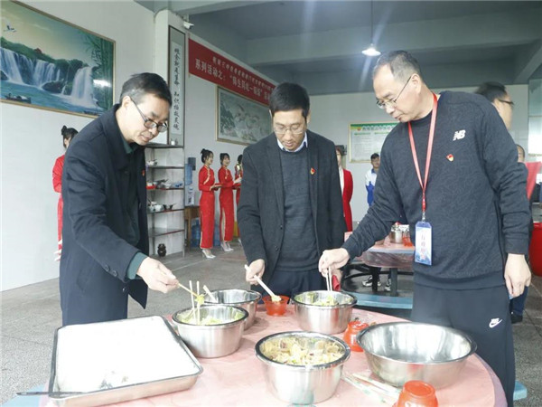 党的百年华诞在即,为深入贯彻落实党的十九大会议精神,全面落实党建引领学校工作的理念,探索党建引领下如何进一步提高后勤服务管理水平,同时也进一步落实上级有关部门对食堂伙食工作的指示精神,2021年4月14日上午,衡南三中“党建办+后勤”两部门联手推出“师生同吃一锅饭、追忆红军餐”活动。本次活动特邀校领导、党员代表、教师代表、职员代表、学生家长代表、学生代表等35人,担任食堂伙食质量评判员,同评 “一桌饭”。