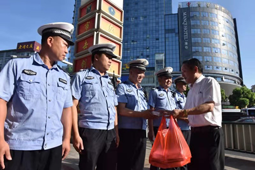 韩广宁将万利隆精心准备的“早餐包”和防暑降温药品送到值班交警的手里,向他们致以崇高的敬意,并表示问候。韩广宁说:“夏日炎炎,为了市民平安出行,你们辛苦了。希望大家能注意防暑降温,保重身体,维护交通平安、畅通”。韩广宁说,万利隆食品是湘潭本土企业,30多年来一路发展壮大,企业根植于湘潭,固然也要回报于湘潭。他们希望能为社会多尽一份心,多出一点力。