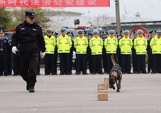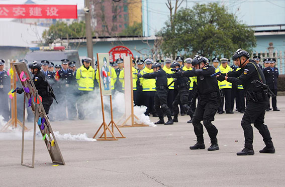 紧接着,开始警务技能汇报表演。各警种齐上阵,分别展示了队列礼仪、警犬搜索电诈工具、警组战术应用射击、处置刀斧砍杀警情演练等相关训练科目。在队列礼仪展示中,