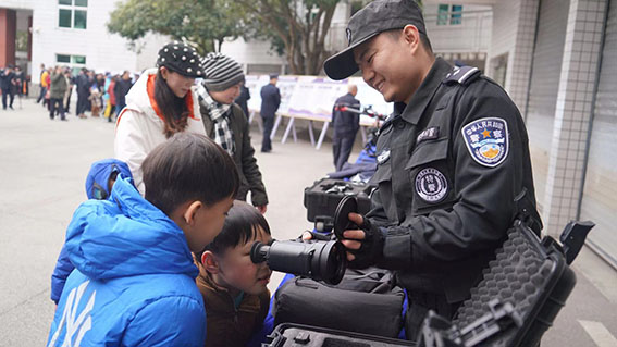 警务技能表演结束后,现场观众纷纷移步到警用装备展示区、展板宣传区和史志馆参观,零距离体验警营生活。在警用装备展示环节,高科技装备悉数亮相。夜视仪、热成像仪、光学窥镜等“黑科技”吸引了眼球;警用多旋翼无人机巡逻、排爆机器人等技能演示带来的视觉冲击,让观众近距离体验到警务科技便民服务的创新应用成果;防暴枪、九二G式手枪、85式狙击步枪、搜排爆服等各种炫酷警用武器装备吸足了关注力。除了特色体验项目外,民警还利用宣传展板、开设警民游戏互动等方式现场讲解防电信诈骗等相关知识,为观众释疑解惑,提高安全防范意识,强化警民互动升级。