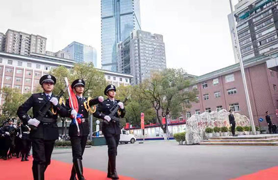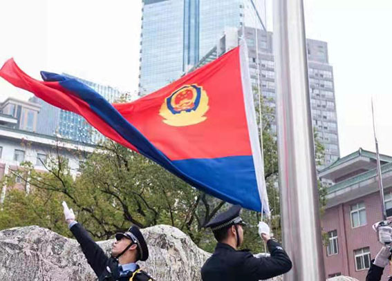 “迎警旗!”随着指挥员下达口令,由24名特警队员组成的护卫方阵,护着中国人民警察警旗,踏着铿锵的步伐,正步走向升旗台。“升警旗,奏人民警察警歌。敬礼——”在嘹亮的警歌声中,全体民辅警整齐列队、庄严敬礼,代表着人民警察荣誉、责任和使命的警旗首次在长沙公安机关升起,警旗上警徽闪亮,红蓝旗面辉映交相,令人心潮澎湃,豪情满怀。