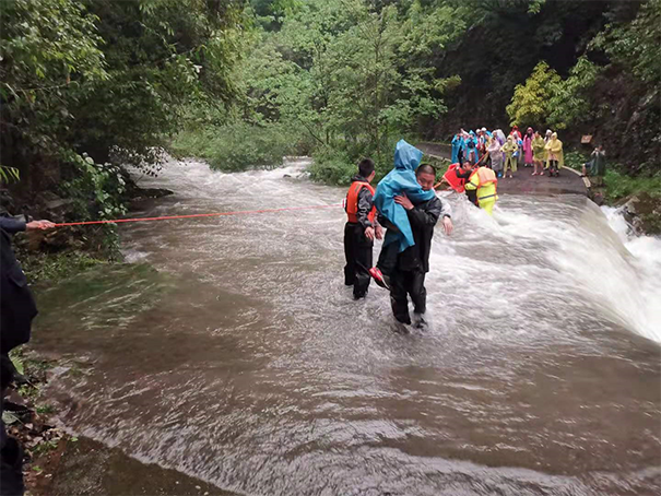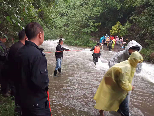 原来,这批游客久闻借母溪乡的秀丽景色,所以慕名前来想一睹这里原始生态的风采。当日8时许,他们徒步进入景区。没过多久,突然降下倾盆大雨,使得溪水暴涨。湍急的溪水挡住了他们前行的道路,领队带着大家原路折返。当他们往回走时才发现,来时的路也被阻断了。屋漏偏逢连夜雨,他们的手机没有信号,无法与景区的工作人员取得联系。其中一名游客抱着试一试的心态拨打110报警求助,没想到电话铃才响了两声就接通了。接到报警后,借母溪派出所民辅警立即将这一情况向乡党委政府汇报,带上救援工具紧急赶往现场。