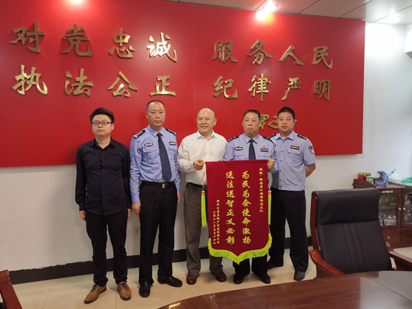 5月19日上午,衡阳某房地产开发有限公司为衡南县公安局经侦大队送来一面绣有“为民为企使命激扬,送法送智正义必彰”的锦旗,感谢经侦大队民警在案件侦办和追赃挽损中付出的辛勤努力。局党委副书记、常务副局长符芳华,经侦大队长李朝晖接受了锦旗,并现场向受损企业返还钱财,与企业主亲切交谈,向他们征询对公安工作的意见和建议。