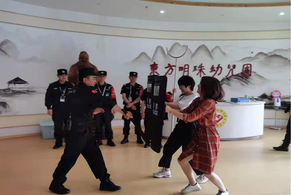 培训过程中,教官杨鹏严格按照实战要求,分别对盾牌、警棍、灭火器等装备的使用方法进行现场讲解,对两人、三人进攻防御队形进行现场演示,并与现场保安、幼师人员进行了交流互动,现场模拟演练,切实做到理论与实践相结合。
