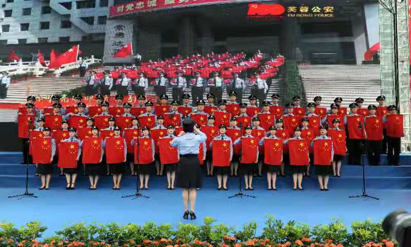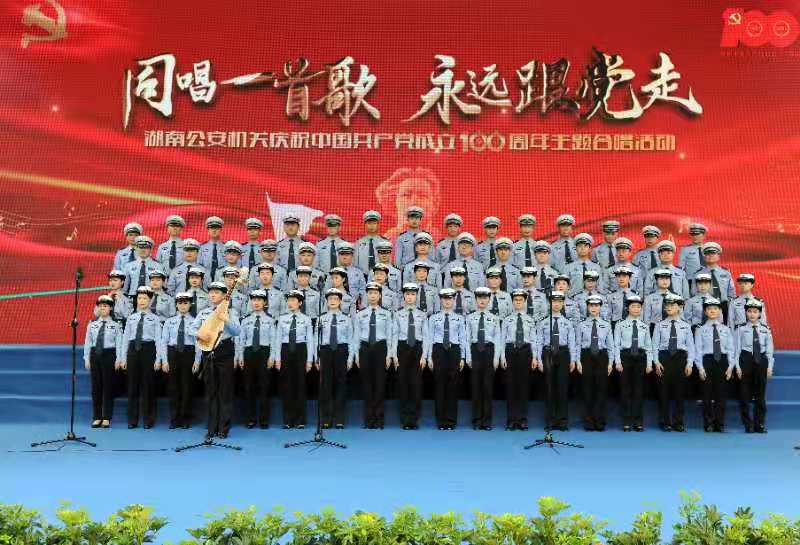 6月18日上午,湖南省公安厅、长沙市公安局在长沙市滨江文化广场举行庆祝中国共产党成立100周年“同唱一首歌——永远跟党走”主题合唱活动。省公安厅机关和长沙市公安局7支代表队分别演唱了《歌唱祖国》、《社会主义好》、《唱支山歌给党听》等脍炙人口的经典歌曲;最后,500余名民警在湘江畔齐声歌唱《没有共产党就没有新中国》、《中国人民警察警歌》、《永远跟党走》。饱含激情、气势雄壮的歌声在广场上空飘扬,吸引了许多周边群众、游客伫足倾听、自发加入合唱。参加合唱的省公安厅机关党委专职副书记孟晓丽表示:跨越时空的经典红歌是历史的足音,也是强大的精神动力,激励公安队伍在习近平新时代中国特色社会主义思想指引下,坚决履行新时代使命任务,为实施“三高四新”战略、建设现代化新湖南努力奋斗,以优异成绩向建党100周年献礼。