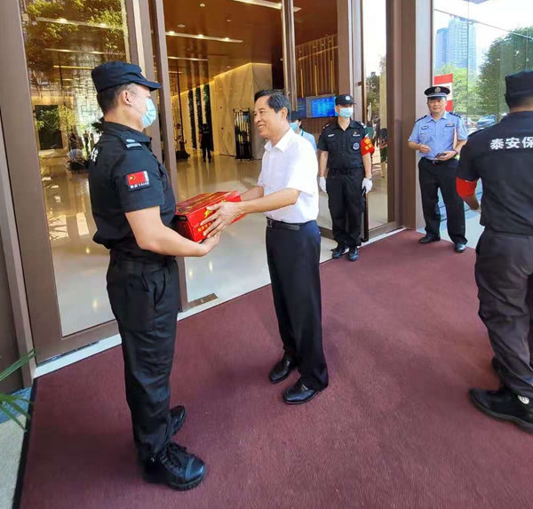 随后,谭和平会长一行在保安公司负责人、驻点保安队队长的陪同下,观摩了泰安公司驻交通银行保安队、滨江公司驻湘雅三医院保安队应急处突演练,并为一线保安员们送上了防暑物资。