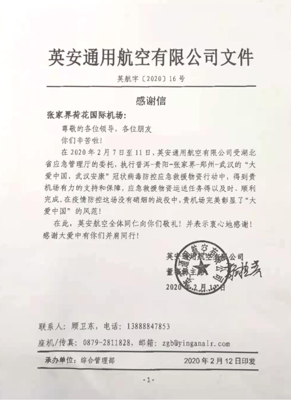 助推通用航空发展,2020年,共安全保障低空游览飞行100余架次、滑翔伞飞行300余人次,为张家界通航市场多元化发展贡献力量。自新冠疫情爆发以来,塔台班组积极响应上级疫情防控指挥部号召,主动做好通航防疫物资运输保障工作。2月10日,接到英安通用航空公司申请,需将云南红十字会一批医疗物资紧急运往武汉,驰援疫区,塔台积极主动协调,悉心保障该航班在本场起降,该批医疗物资及时、顺利送达。