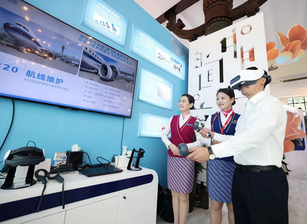 “我看到餐车了,是这么打开吗?太好玩了!”在位于南航展台的VR培训互动游戏区域,观众李先生佩戴上AR智能眼镜,秒变空乘“小姐姐”,感受客舱虚拟培训课程。观众还可以“化身”飞机维修师,体验南航AR智慧维修场景。据了解,南航将AR智慧维修、培训技术研发应用到实际工作中,开发“虚拟现实航空实训平台”,采用3D技术,1:1仿真虚拟出多维度的培训环境。在规避真实维修操作风险的同时,平台实现多场景、多频次的规范操作培训,提高机务维修和客中服务的质量与效率,开启了民航培训智能化时代。