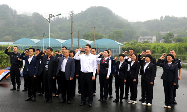 在溪口樟树村千年古樟“红军树”下,全体成员聆听了贺龙、萧克等领导红二、六军军团当年在树下召开动员大会,开辟红色革命根据地、成立苏维埃区政府、建立红色政权的故事。在红军树下,大家迎着细雨,举起右手,庄严宣誓,重温入党誓词。