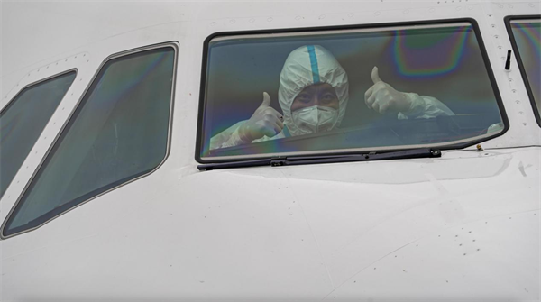 (飞机落地长沙黄花国际机场后,飞行员竖起大拇指)