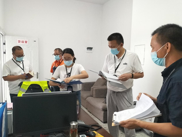 机场党委班子成员张郑昊带队督导货运分队疫情防控工作,对防控安全培训记录、消杀台账、异常旅客行李台账、人员在岗等情况进行检查,确保实现货运通道疫情防控安全百分百。