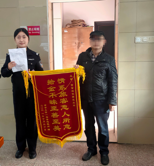10月30日上午,一名男子手持一面书有“心系旅客急人所急,拾金不昧至善至美”的锦旗,走进吉首火车站派出所,对该所民警为他找回装有贵重物品的挎包表示万分感谢。