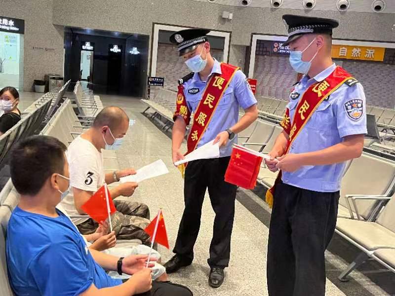 该所还组织一支青年民警志愿服务队,扎实开展“我为群众办实事”实践活动,立足岗位祝福祖国母亲73岁生日快乐。民警们在候车室开展反电诈、打假票、防疫情、安检宣传的同时开展“我与国旗同框”、赠送小国旗等形式多样的庆祝国庆节活动,让旅客群众以独特的方式与国旗合影,为祖国喝彩,感受自己作为一名中国人的骄傲与自豪,厚植爱党、爱国、爱家情怀。