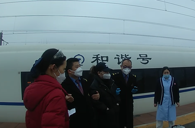15时35分,列车驶入2站台停稳。民警、工作人员与医护人员一同进入16号车厢,将晕厥的邵女士背出车厢。争分夺秒地与列车长办理交接手续后,又立即协同医护人员用轮椅将疾病旅客转送至救护车内。
