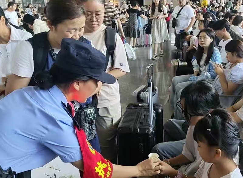 当天,张家界市共青团市委组织的歌舞和地域特色的民俗表演,吸引了众多旅客驻足观看。热烈的气氛中,民警们携手团市委志愿者及车站工作人员,一起为旅客们分发小国旗、月饼及茶水。