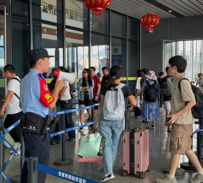 张家界西站派出针对节日期间,大量旅客前往著名风景区张家界旅游,返程旅客急刷增多的实际情况,加大警力上岗,做好售票厅、进出站口、候车室和站台的警力守护。为了输送更多往返的旅客,9月29日至10月8日,张家界西站加开158趟凌晨列车,保证旅客往返需求。张家界西站派出所民辅昼夜奋战,实行24小时值班轮守制,确保旅客走得安全、走得放心。