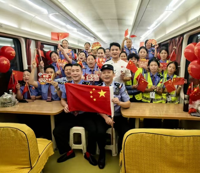 列车运行在秋色如画的湘西大地,餐车里五星红旗格外鲜艳。乘警谢曙文表示:“在这个举国欢庆的日子里,我们希望用歌声传递彼此对祖国的美好祝愿。”《歌唱祖国》的旋律响起,在场人员自发加入合唱。