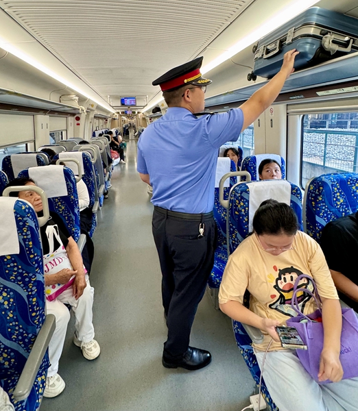 在日常服务中,欧阳鹏震始终心系旅客。巡视车厢时,他格外关注老人和带孩子的旅客,常主动上前搭话:“阿姨,您的水杯需要续热水吗?”“小朋友,别在过道上跑哦,小心碰到。”看到旅客的行李放在行李架边缘,他会顺手调整位置:“您这箱子有点沉,我帮您固定一下,免得行车时滑落伤人。”