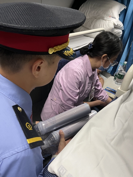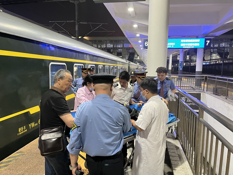21时08分,候车室值班员青年骨干文炎林等提前在进站口等候,21时13分,株洲市人民医院救护车到达株洲站东进站口,文炎林立即引导他们从专用的安检通道进入,走候车室北头直梯下降到站台。站台值班员廖万强提前在站台直梯处等候,21时20分,K576次列车驶入6站台停稳,廖万强与列车长快速办理交接手续,21时23分,术后重点旅客及医生到达其车票对应的7号车厢,站台安全员陈深根帮忙一起把担架抬入车厢上,文炎林拿着旅客的医用氧气瓶紧随其后。在“彩虹”服务队和车站公安的接力帮助下,施女士及其家人顺利登上火车。“真的太感谢了,我要为车站的暖心服务点赞。”施女士家属对车站服务表示了感谢。