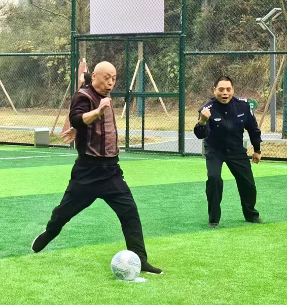 健步走结束后,趣味点球活动随即登场,青年民警耐心讲解规则并示范动作。平日里沉稳持重的老民警们,此刻纷纷化身“运动健将”,摆好站位、瞄准球门、抬脚射门。有的精准破门,引来阵阵喝彩;有的角度稍偏,引得众人开怀大笑。现场掌声、欢呼声此起彼伏,大家在轻松愉悦的氛围中,体验着运动的快乐,重温着并肩作战的深厚情谊。