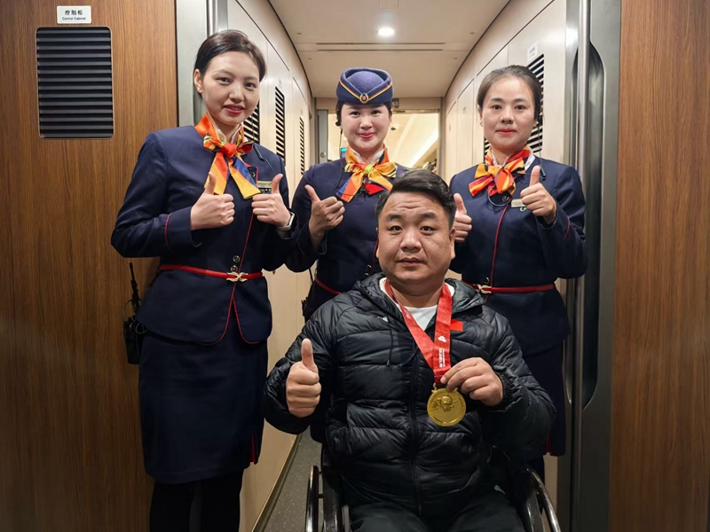 12月16日,惠州北开往长沙南的G8439次列车停靠广州白云站时,4名载誉而归的湖南残特奥健儿登上列车。这几位健儿在赛事中奋勇拼搏,各自斩获奖牌,带着荣誉踏上返程旅途。
