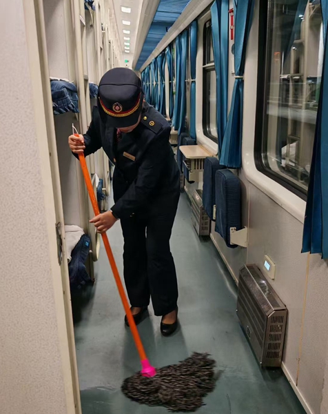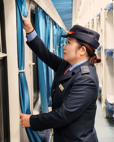 刘力的丈夫也是综合车队的一名列车长,夫妻二人如同铁路线上两条并行的轨道,各自奔驰,聚少离多。孩子从小托付给父母照料,家长会、生日、节日……刘力错过了太多陪伴孩子的时刻。电话里那句“妈妈你什么时候回来”,常常伴着车轮声成为她心中最柔软也最沉重的挂念。但她从未因家庭困难影响工作,反而把对家人的愧疚转化为对旅客更细致的关怀。“看到旅客平安到家,就像看到自己的孩子平安归来一样欣慰。”刘力这样说。