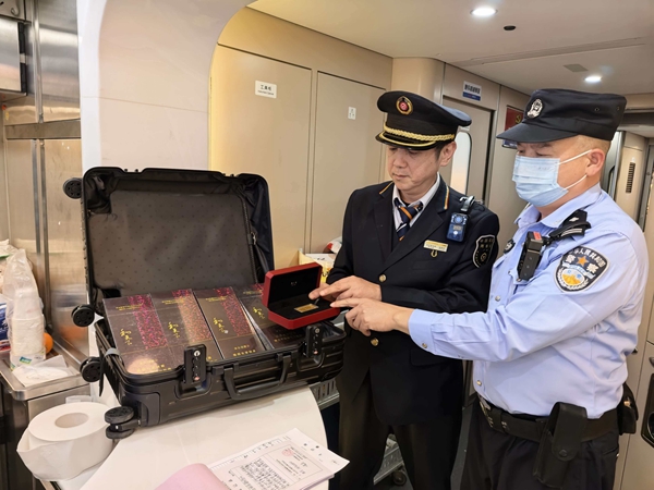 伍守文随即致电旅客确认箱子样式,在得到肯定答复后,他与乘警共同开箱核验,箱内四条千元和天下香烟、一件三万多余元左右黄金饰品,均与旅客所述一致。经协商,约定将箱子移交至潮汕站。