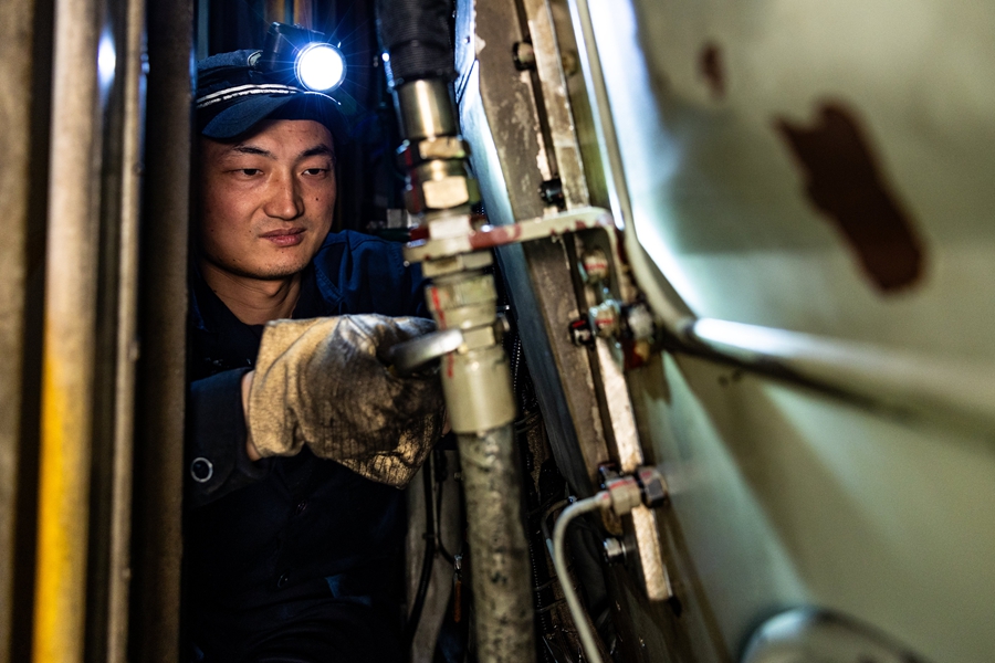在泵体连接处,只见龙洪波屏气敛息,时而听燃油泵电机运转声响,时而拭去管接口的油污,检查有无渗漏。随着头灯光束,彭荣辉的目光则沿着粗壮的燃油管一寸寸移动,就像给机车做“血管造影”。他们一起打开粗滤器,仔细察看滤芯,发现只有少许极细的杂质,属于正常范围。接着又是精滤器,拆解后,滤纸干净,也未见异常阻塞。