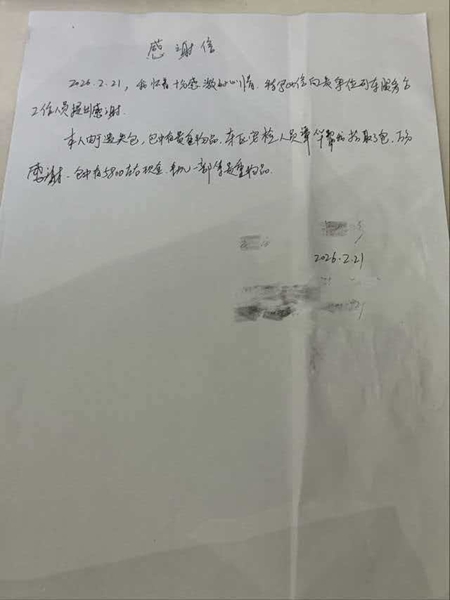 2026年2月21日,株洲火车站客运车间“彩虹”服务台收到了一封手写感谢信,字里行间表达着对株洲火车站安检工作人员谭华以及“彩虹”服务台工作人员的感激,也传递着铁路服务温暖人心的真挚情谊。