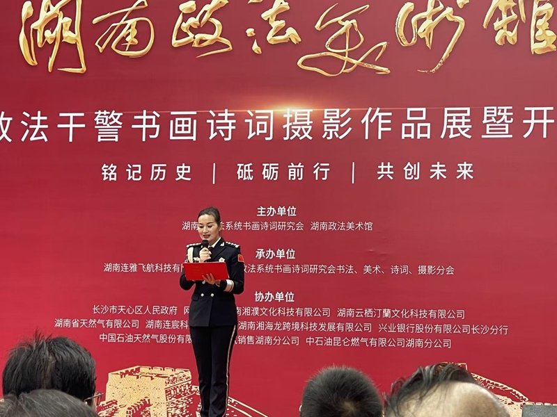 湖南省政法系统书画诗词研究会负责人胡红湘在致辞中表示,湖南政法美术馆的落成是政法文化建设的里程碑,将成为收藏艺术精品、传播法治精神的“文化客厅”。全省政法干警书画、诗词、摄影作品展同步启幕,集中展出由干警创作的艺术作品,涵盖书法、国画、摄影及诗词等门类,生动展现了政法干警的初心使命与为民情怀。