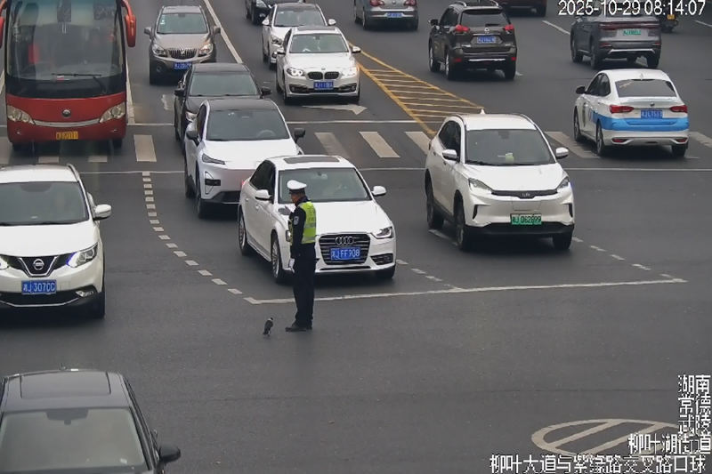 10月29日早高峰,电力路口的车流如潮涌来,柳叶湖大队的执勤交警早已挺立在路口。清脆的口哨声在晨雾中穿梭起伏,标准的指挥手势利落有力、一气呵成,每一次抬臂、转身都精准引导车流,默默守护着路面的通行顺畅。