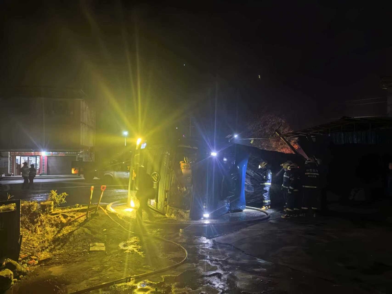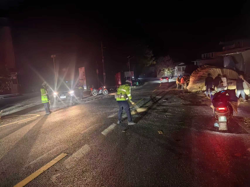 2025年12月1日20时许,接到指挥中心派警指令的衡南县公安局交警大队车江中队民辅警赶赴至S219省道松江镇凉亭村路段,只见一辆牌号为鲁Q57***的重型半挂牵引车侧翻在道路中间,由于车型庞大,路旁居民搭建的临时棚子和电线杆被车子压坏,几处刮断的电线散落在地面,更危险的是空气中弥漫着浓厚的汽油味,大量汽油从油箱溢出,“跑”满了整个路面,存在极大的燃爆风险,情况十分危急,车辆驾驶员王某及乘坐人摸着流血的手臂,心有余悸的站在路旁。