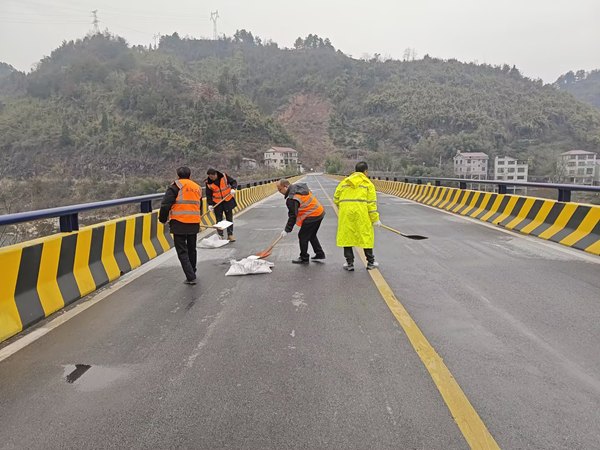 1月21日,得知干线G209大坳路段及兰村桥有结冰迹象,工作人员马上前往处置。在现场,工作人员设置警示标志,提醒过往司机谨慎驾驶,然后洒布融雪剂防止路面结冰。中心还派出4支应急队伍,加强对国省干线G209、G354、S254、S332、S320安全巡查,做到隐患及时发现、及时处理。