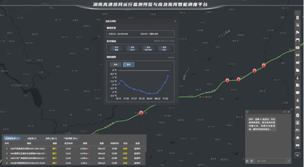 该系统在此次低温雨雪冰冻天气中发挥了关键作用,通过1400余套物联网温湿度监测仪实时回传路面、桥面精准温度数据至“湖南高速路网运行监测预警与应急指挥智能调度平台”,实现对易结冰路段的动态预警与智能调度,推动高速公路应急处置从“被动响应”向“主动预防、精准调度”的深刻转变。