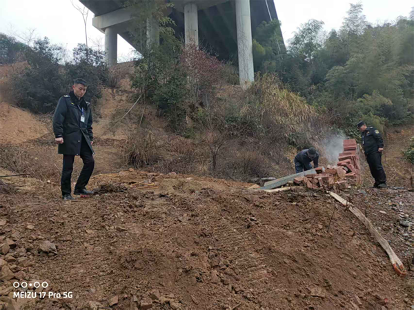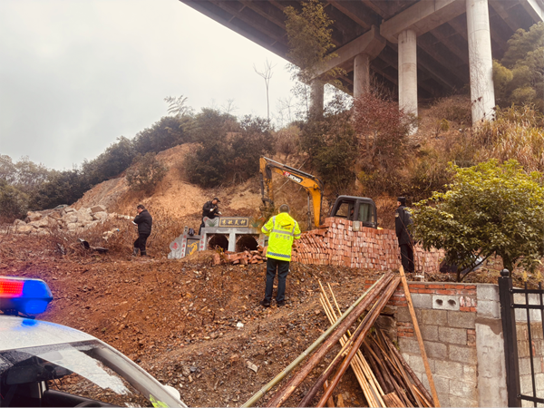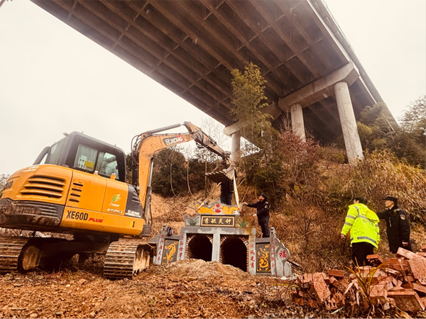 据了解,当地极少数居民法律意识淡薄,在平洞高速桥下空间违规修建“活人墓”,严重危及高速公路通行安全。根据湖南省交通运输厅“三保三大一创”专项整治部署,在支队的统一调度下,高速公路执法大队二中队将辖区内高速桥下空间管控列入工作重点,充分依托高速公路各职能部门联勤联动的工作机制,开展联合专项整治行动。