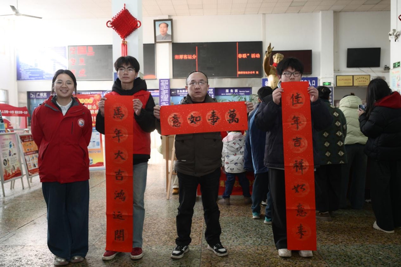 “手写的春联更有温度,也更有年味,拿到春联感觉回家的路都更近了一步,太贴心了!”正在候车的旅客李先生手持刚领到的春联,脸上满是喜悦。除了笔墨传情的送春联活动,现场还设立了多个志愿服务岗,身着统一服装的青年志愿者们分工明确、热情满满,为旅客提供购票指引、行李搬运、咨询答疑、重点帮扶等全方位服务。针对老年人、残疾人、孕妇、儿童等特殊群体,志愿者们主动上前开辟绿色通道,全程贴心陪同,用真诚的微笑、细致的服务,化解旅客出行的疲惫,传递着千年雨湖大地的善意与温情。