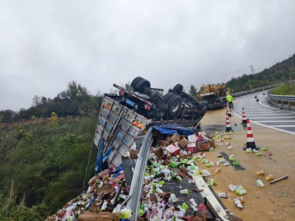 元月30日中午11时30分,高速公路执法大队二中队突然接到平益高速公路监控中心电话:“一辆货车在武深高速与平益高速互通道路上发生侧翻事故,请你们帮忙救援!”当班执法人员向日光等人正在吃午饭,闻讯立即放下餐具,火速驾驶执法车奔赴现场。