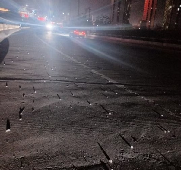 夜幕降临,车流不息。4月26日武冈市国道G356线护城桥主干道路面出现大量尖锐硬质杂物散落隐患,杂乱分布的尖状物体散落行车路面,加之夜间视线昏暗、过往车辆通行车速较快,极易造成车辆轮胎破损、底盘剐蹭,极易诱发车辆失控、道路交通事故,严重威胁过往群众出行安全与道路通行秩序。